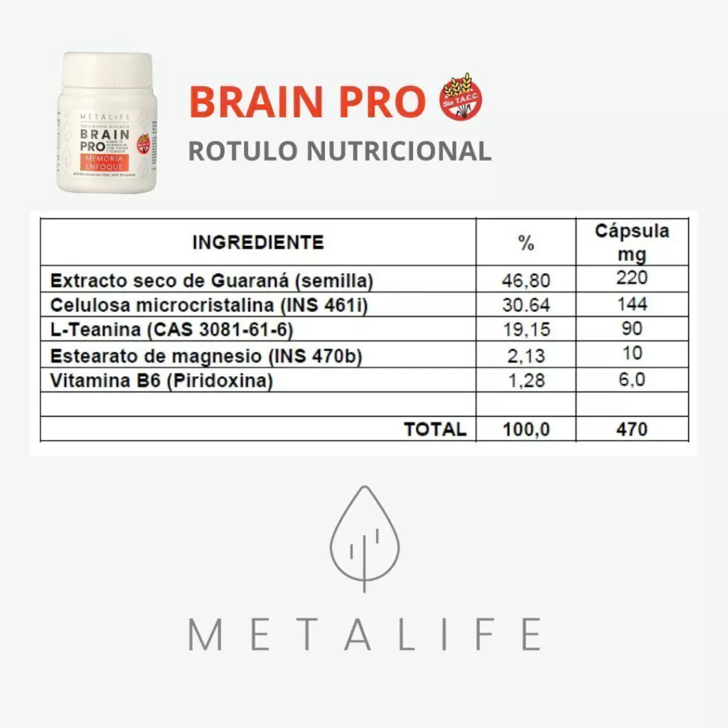 Brain pro, la combinación de cafeína + Teanina puede ser justo lo que necesitás. Los beneficios de una cantidad exacta de cafeína (derivada del Guaraná), igual a aproximadamente un taza de café, combinada con el aminoácido l-teanina, juntos producen un estimulante con efecto energizante que no causa ansiedad o nerviosismo que puede causar el exceso de cafeína. En los porcentajes adecuados, estos dos ingredientes funcionan sinérgicamente para ponerte en tu zona de enfoque y concentración necesario para rendir tu 100 %.